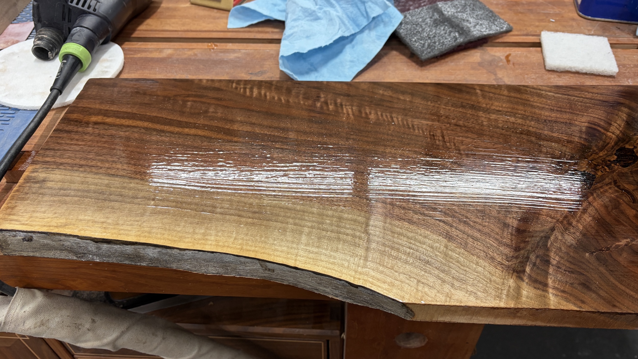Use a clean cotton rag, ideally old T-shirt material. Fold it into a palm-sized pad for control and even distribution. Or consider using Makrs Pads (Save 15% using our code TWW). While these are a little more expensive, the microfiber surface produces and exceptionally smooth finish when used with oils and I highly recommend them. See my quick review here.