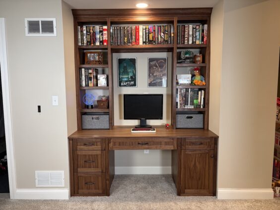 Of course, the project expanded a bit along the way. Once the old desk came out, Nicole asked for upper bookshelves too, which meant more demo, some drywall work, reshaping the opening, and moving a light. You know, just a few tiny “while you’re in there” additions. But the extra effort was worth it. The final result is a custom built-in desk with integrated storage, a clean fitted look, and a matching upper bookcase that makes the whole alcove feel finished.