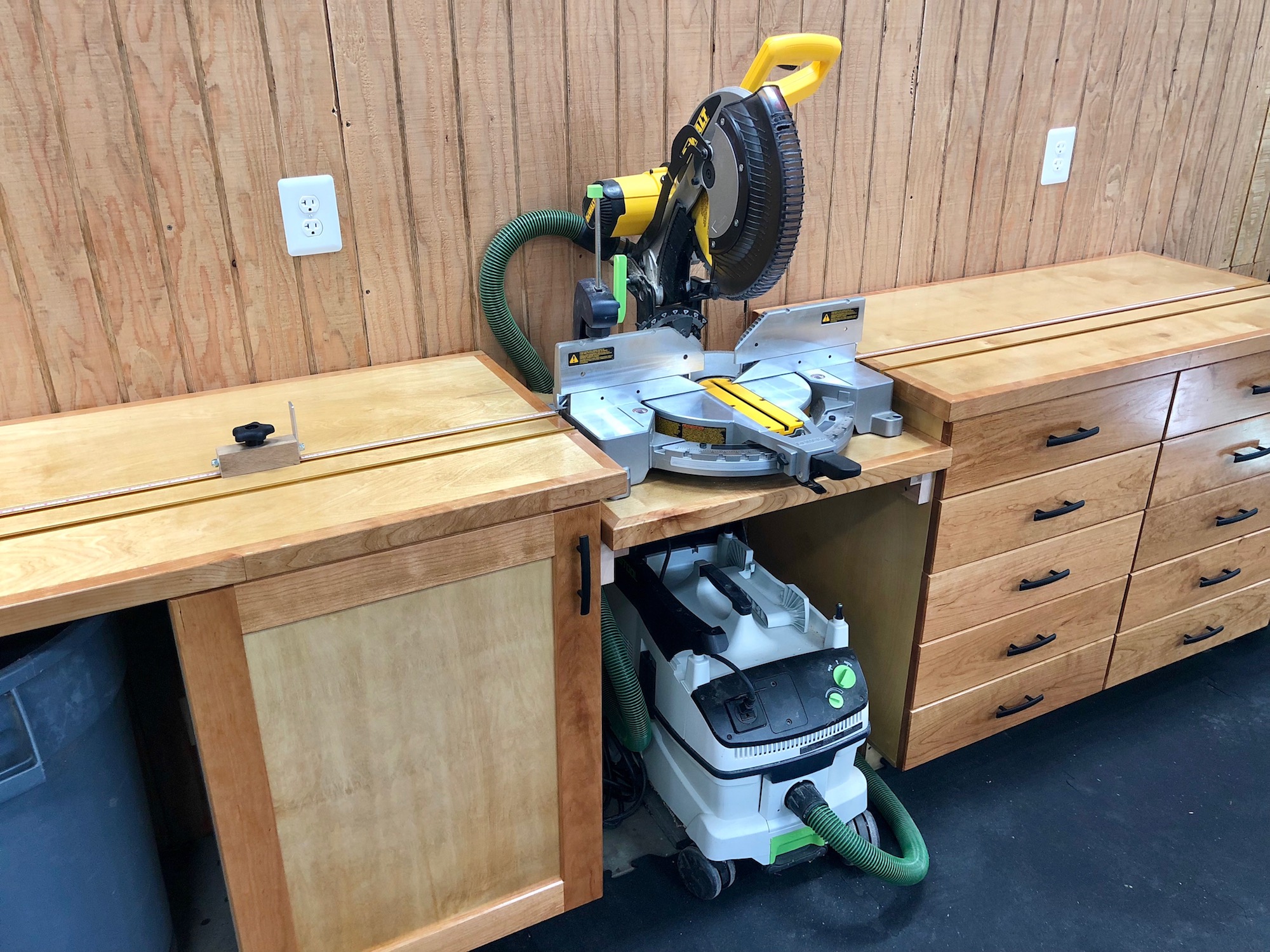 This station is built around three cabinets with an 8-foot work surface to the left of the saw and a 4-foot surface to the right. The cabinets include a practical mix of drawers, doors, and pull-out trays, all on full-extension slides. The tops feature dual T-tracks and a fenceless design that allows you to use the entire horizontal surface without obstructions. Best of all, the design can be customized to fit virtually any sliding or standard miter saw.